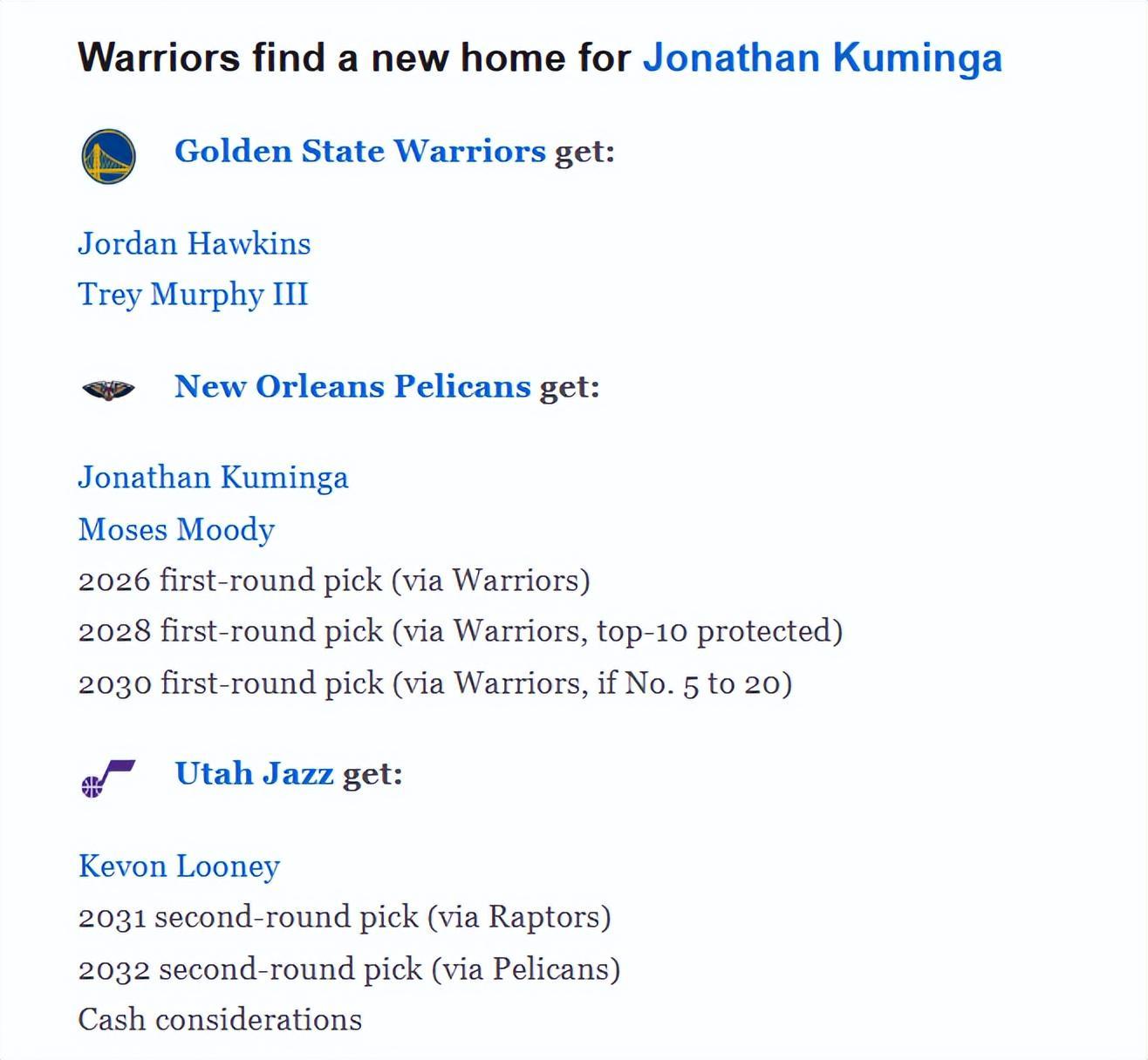 鹈鹕队得到:库明加、穆迪、2026年首轮签(来自勇士的无保护)、2028年首轮签(来自勇士,前10顺位保护)、2030年首轮签(来自勇士,顺位为5至20位时生效)