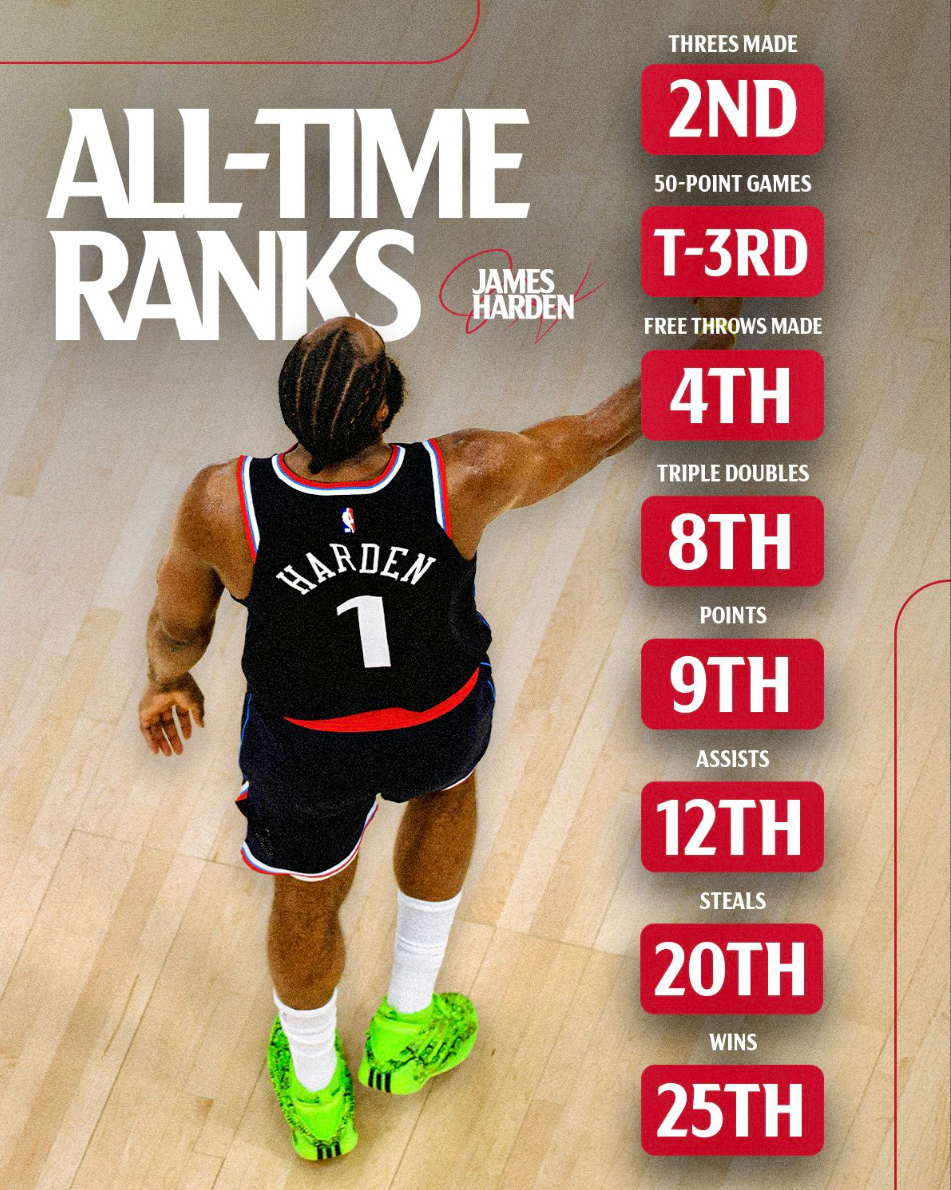快船官方晒出哈登八项历史数据:三分球第二、50+第三、罚球命中数第四、三双第八、得分第九、助攻第十二、抢断第20、胜场数25。
